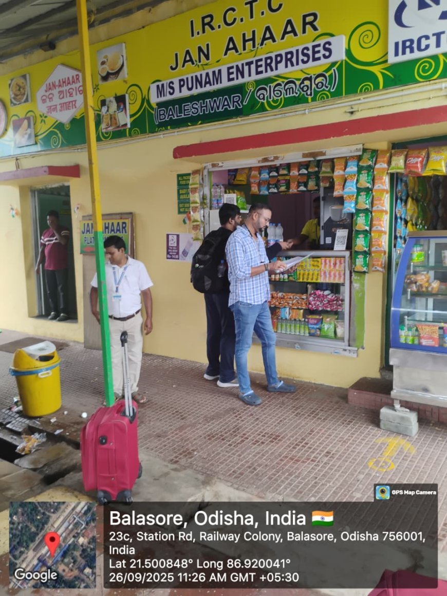 At Balasore station, intensive inspections were carried out at catering stalls, Jan Aahar units, food plazas, and base kitchens to ensure hygienic food handling, quality standards, and cleanliness in line with the Swachh Aahar Initiative.